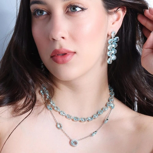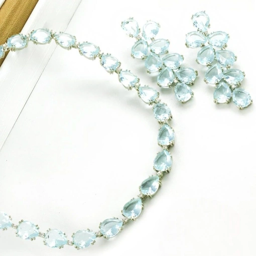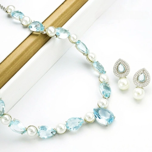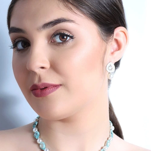 Brinco Banho De Ródio Branco Gota Zircônia Azul Claro e Pérola