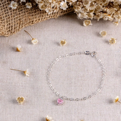 Pulseira Prata 925 Coração Com Zircônia Rosa